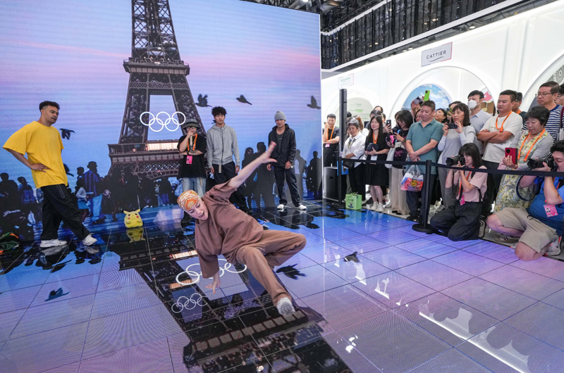 2024年9月14日,在2024年服貿(mào)會(huì)國家會(huì)議中心綜合展區(qū)的主賓國法國展臺(tái),中法兩國街舞好手在表演霹靂舞。新華社記者 陳曄華 攝