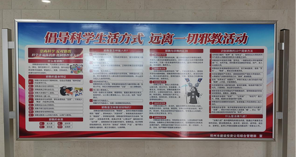 為了進(jìn)一步提高國(guó)企員工反邪教意識(shí),認(rèn)識(shí)邪教的危害,切實(shí)增強(qiáng)自覺(jué)抵御邪教侵蝕的能力,營(yíng)造積極向上、健康和諧的工作氛圍。4月25日下午,鄭州市建設(shè)投資集團(tuán)有限公司組織全體干部員工開(kāi)展反對(duì)邪教宣傳活動(dòng)。利用PPT宣講、宣傳展板、網(wǎng)站、懸掛橫幅等方式,向員工宣傳邪教的種類(lèi)、危害和邪教組織的種類(lèi)等,引導(dǎo)國(guó)企干部職工認(rèn)清邪教本質(zhì),提高識(shí)邪、防邪、拒邪能力,筑牢反邪教思想防線,做到對(duì)邪教歪理邪說(shuō)不聽(tīng)、不看、不信、不傳。